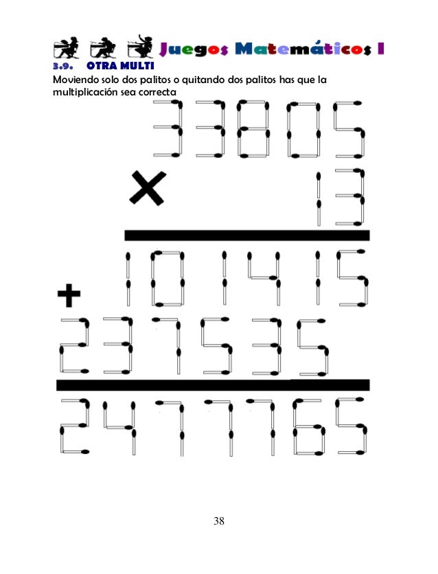 Reto a tu inteligencia: Corrige la operación moviendo sólo un palito - La Red from static.lared.cl Os jogos permitem que os alunos pratiquem os conteúdos de forma interativa, além proporcionar o desenvolvimento do raciocínio. Juego de los 15 fósforos by claudio escobar 61888 views. View more presentations from leonardo palomino. Juegos con palillos y fosforos acertijo matematico pasatiempos enigmas con operaciones ejercicios de razonamiento logico matematico intentalo Los niños pequeños pueden necesitar cierta ayuda de niños más grandes o bien de un adulto. No es fácil aprender a resolver ejercicios, pero es mucho más divertido cuando las matemáticas se aprenden jugando. Ahora puedes jugar a los mejores juegos de matemáticas, gratis online, sin descargar, para niños y adultos. Check out this slideshare presentation: